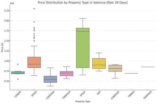 The average sale price for Valencia properties in the past month is $894,217, with a median sale price of $829,000. This slight difference between the average and median suggests a stable price range, with fewer extreme outliers affecting the overall market. These price points reflect the demand for residential space in Valencia, maintaining a steady market for both single-family homes and condos.